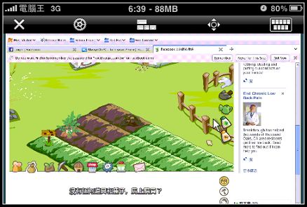 AlwaysOnPC裡面的瀏覽器支援Flash,所以就讓iPhone跟WM的Skyfire一樣可以用iPhone玩臉書的小遊戲與種菜了: