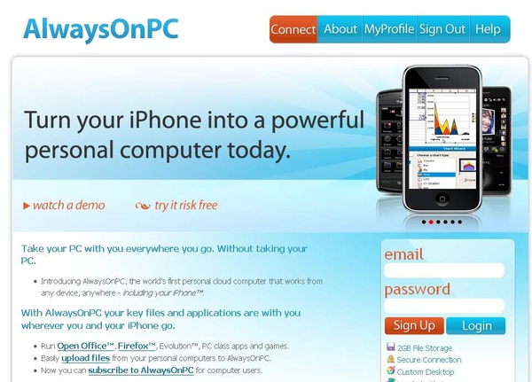 這一項服務有點類似在遠端伺服器中擁有一台虛擬主機,在這個主機中你可以編輯你的檔案或使用常用程式(如OFFICE等等),而且除了可以使用iPhone控制以外,也可以在外面的一般電腦使用,等於是在雲端有了一台隨時等你使用的虛擬電腦,一般人也許會覺得用處不大,但如果你使用的網路是檔FACEBOOK或特定網站時AlwaysOnPC就可以發揮很大的功用了。