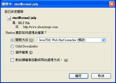 程式會下載一個JAVA程式,存檔後選擇開啟(筆者使用FIREFOX)上網: