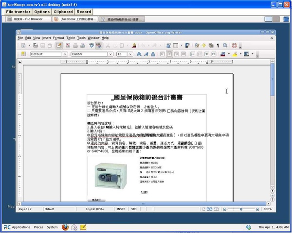 當然也可以用AlwaysOnPC的OPENOFFICE開啟Word檔編輯檔案(但只能輸入英文),OPTION則是AlwaysOnPC裡面的控制設定,要結束連線只要點選"X"就好了: