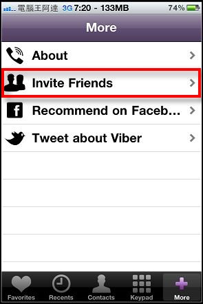 最後的「More」有版本介紹與將「Viper」透過臉書、Tweet介紹給親友,但最快的方法就是使用裡面的「Invate Friend」(邀請朋友)直接傳簡訊給朋友:
