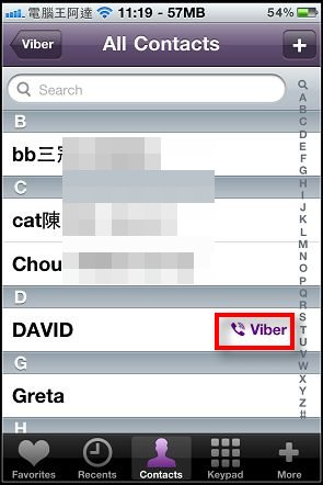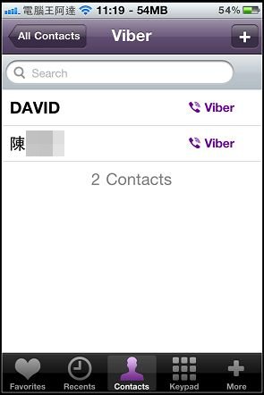 點選聯絡人清單左上角的「Viber」圖示會直接將聯絡人清單中所有使用「Viber」的朋友: