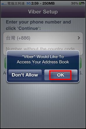 第一次執行Viper會有說明,簡單來說對方的實體電話號碼就是他的「Viber」通話帳號,不像Skype還要詢問對方的電話號碼,所以軟體一開始會詢問您是否要讓「Viber」讀取您的聯絡人資料(這部份跟Whats App一樣,一套網路MMS簡訊軟體),請選擇「OK」: