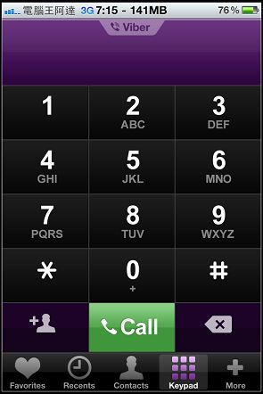 「Keypad」是Viper的撥號介面,也可以直接撥打電話,一樣如果對方已經安裝了「Viber」的話撥打電話就會是全紫色的「Viper」介面(如果對方沒有申請Viper或沒有連上網路的話會自動跳回iPhone預設的撥號畫面):