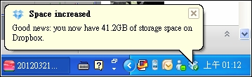 接著您的電腦端Dropbox應該就會收到通知,筆者的空間就由18.25GB暴增到41.2GB了,很簡單吧,有網友說這是不是HTC手機才能用,我個人使用Samsung GalaXy Note,可以正常使用,現在看起來好像是SONY會有問題。請大家測試完回報一下狀況,[品牌/型號/成功與否],如Samsung/Note/成功,另外iPhone的朋友如果真的很想用的話可以用Android模擬器安裝這個APK或請朋友幫忙就好了,有網友回報此方法可用: