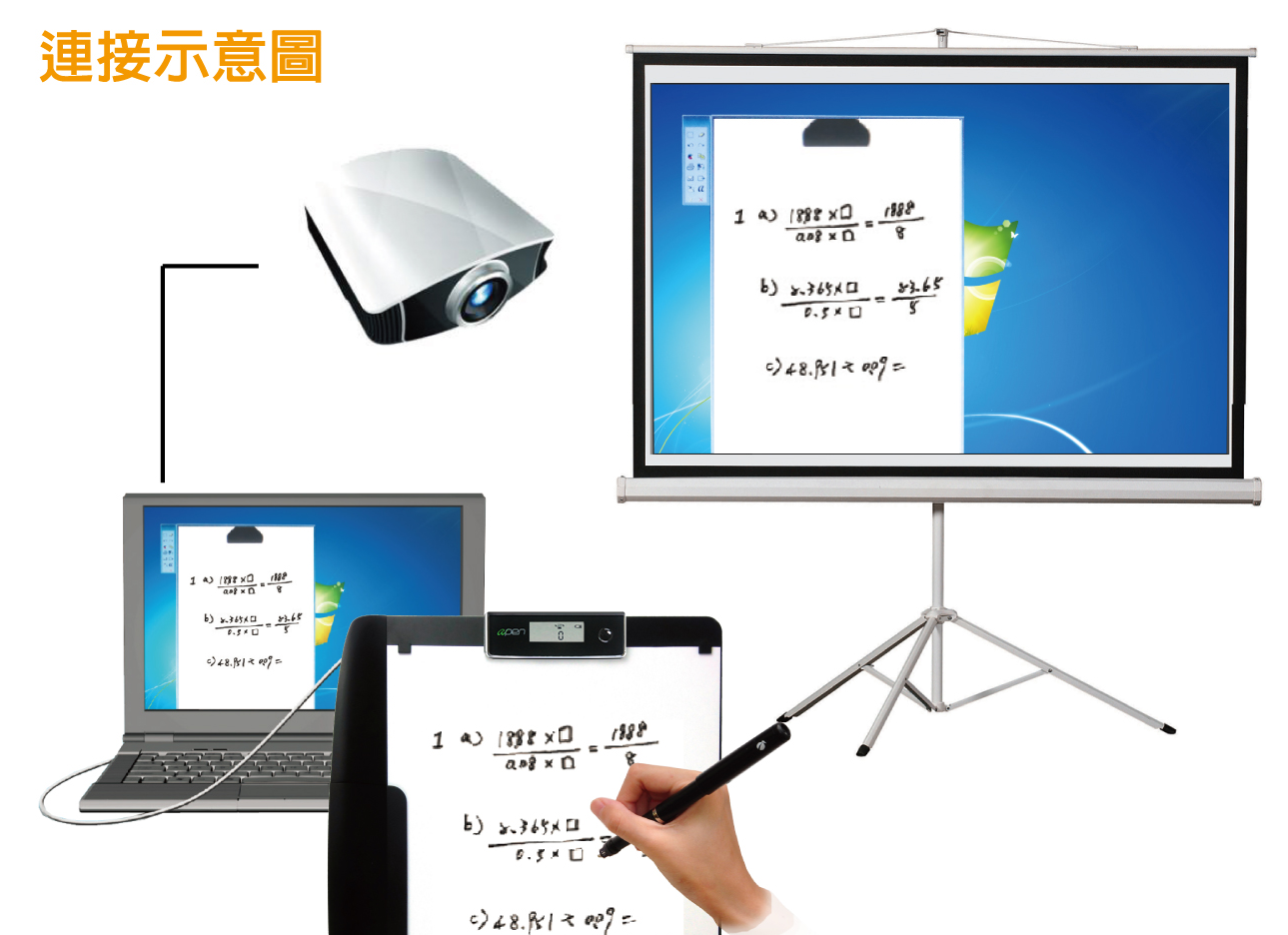 UltraBoard多功能手寫互動板具備多種功能,只要有電腦和投影機,就能輕鬆連結使用,支援筆記與滑鼠兩種模式。在筆記模式下,您可以將書寫在A4紙張上的授課內容與公式推導同步顯示在投影,並且數位化歸檔、文字辨識與管理應用;也可以在滑鼠模式下操作電腦,在教學內容上書寫、重點批註或是錄製上課內容。本款機型除了連接電腦,也可透過專用連接線連接iPad使用,讓您在一般紙張上透過數位筆書寫,將內容同步顯示在iPad螢幕上(搭配專用app),或是將數位接收器儲存內容上傳iPad示範應用。