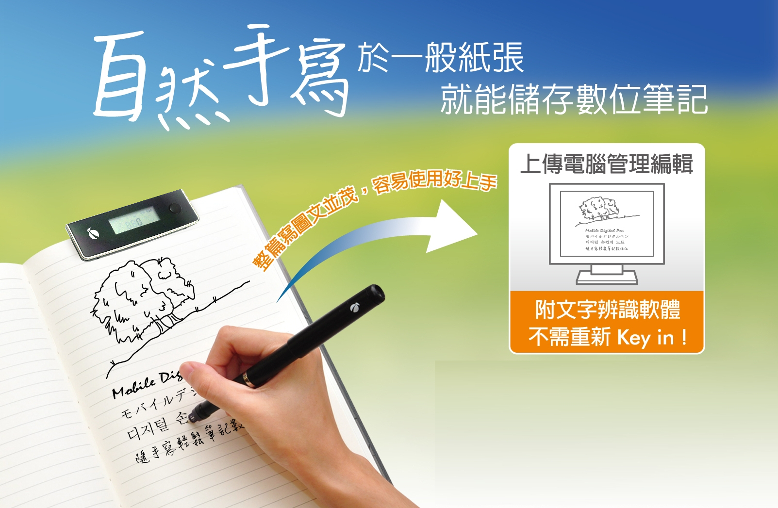在課後或是外出參加訓練,您可以將數位書寫板與數位筆跡接收器分離使用,只要攜帶內建行動記憶的數位筆跡接收器與數位筆,將接收器固定於一般筆記本上方,就可以將手寫筆記的內容預先數位化儲存,之後再上傳電腦進行文字辨識與管理,讓您預備講稿、教案、數位手寫資訊管理更有效率。