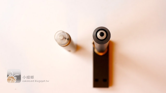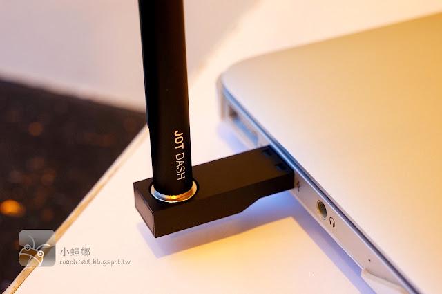話說這個充電座比起其他的產品(Jot Touch或Script 2)所附的座還來得小很多,這樣的設計好處是不會擠壓到其他USB插槽的空間。但這個充電座外型相當方正,邊緣的角也超90度的啦(尖銳狀),聽說國外的設計師就是覺得這樣就是美啦。所以如果手邊找不到兇器的話,這個尖端的地方可以暫時用一下(誤)<---- 這是不良示範,請勿模仿