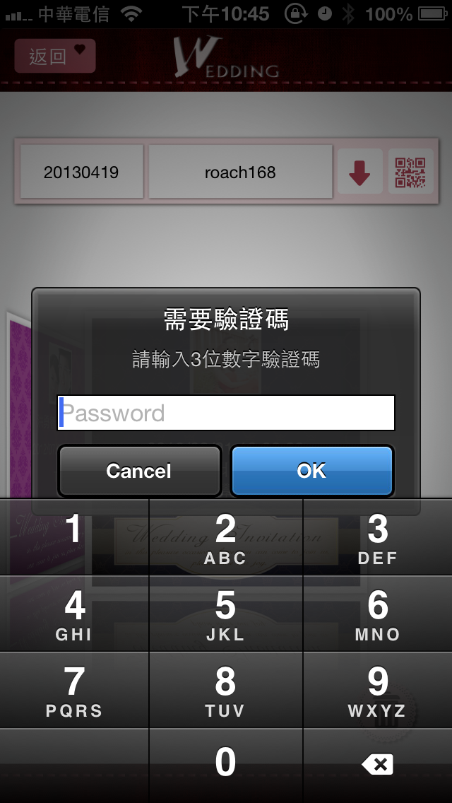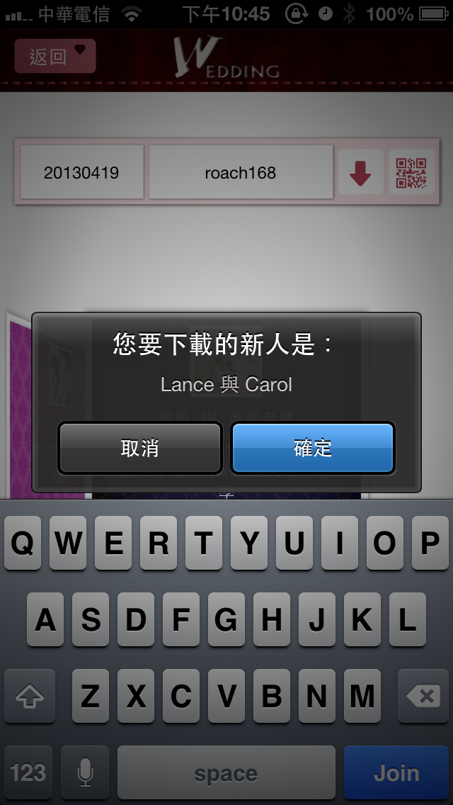 以底下的例子,就會變成下載序號為 20130419roach168,當然你可以選擇對你們有意義的文字當做密語,人家一看到就知道是你們的婚禮