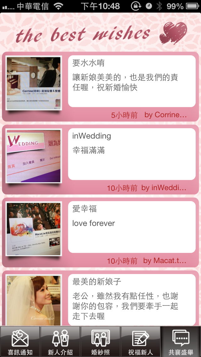 再來就是重頭戲了,利用inWedding的親友祝福的功能,假使你不能參加婚禮,卻又想祝福新人的話,那就馬上照一張照片,寫下祝福的文字,立即就可以上傳到伺服器,讓新人或者其他親友可以看到,是不是很炫呢?