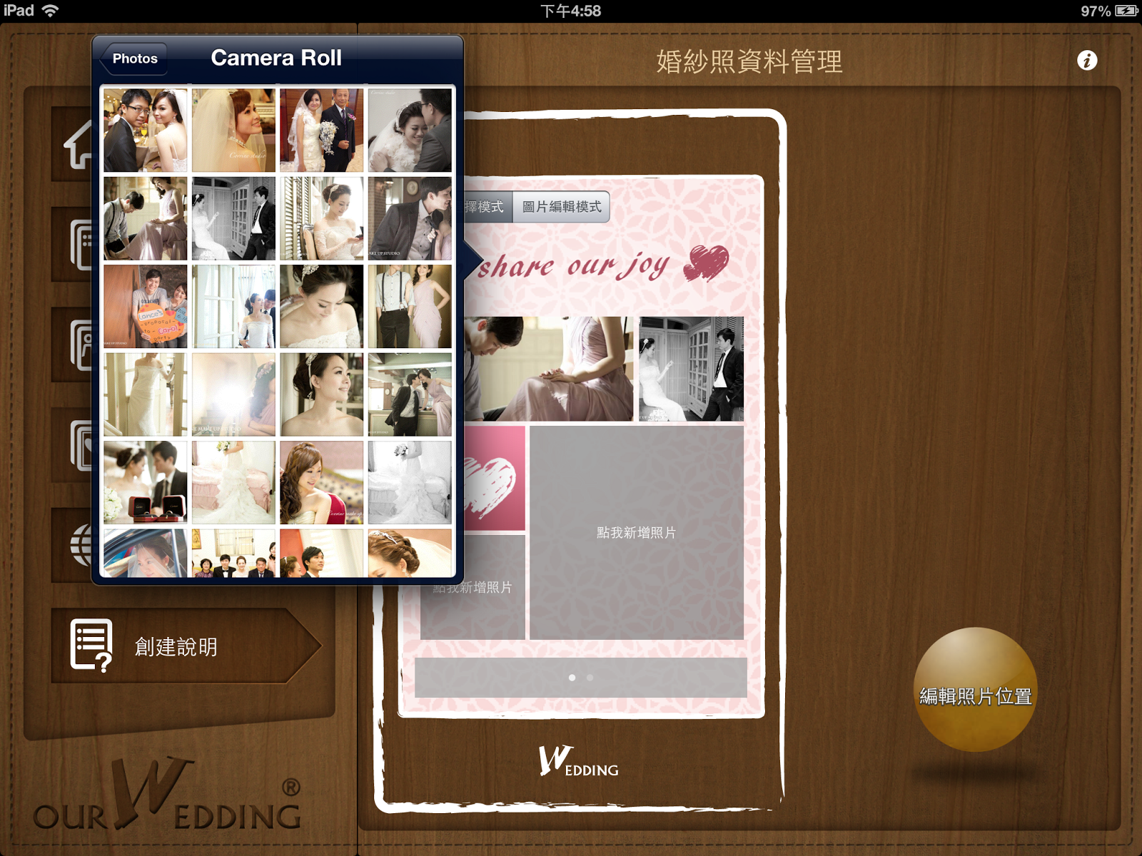 這裡編輯婚紗照,只要點一下想放的位置,選好照片即可(免費版有兩頁可以用,共8張)