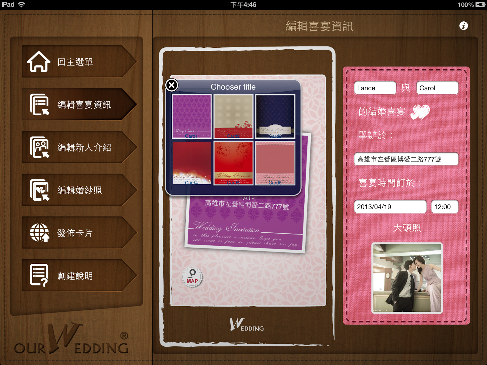 把新郎和新娘的名字給Key上去,舉辦的地點、時間都一一寫入