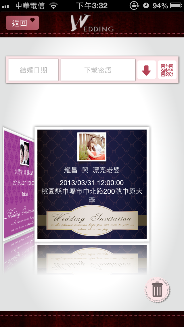 選好新人結婚的日期,把下載密語輸入,就可以在右邊的箭頭按下載喜帖囉