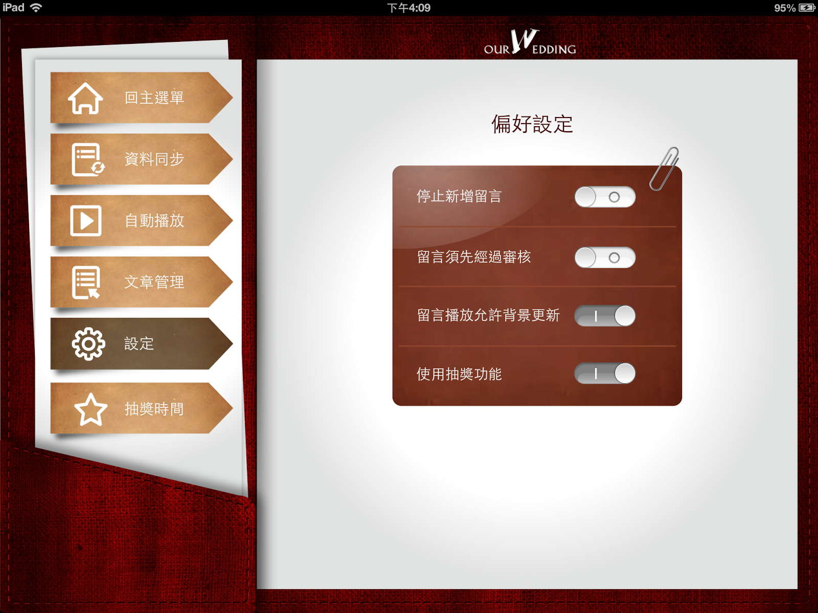 想結婚了嗎?如果這一套App符合你的需求,可以跟廠商詢問看看更詳細的服務喔,我看它裡面好像有許多支援服務,像是如果你沒有iPad的話,也可以採取租用的方式來使用,還包括場地勘察,網路架設的問題,他們的團隊都會細心地幫客戶解決問題,感覺挺不賴的啊!